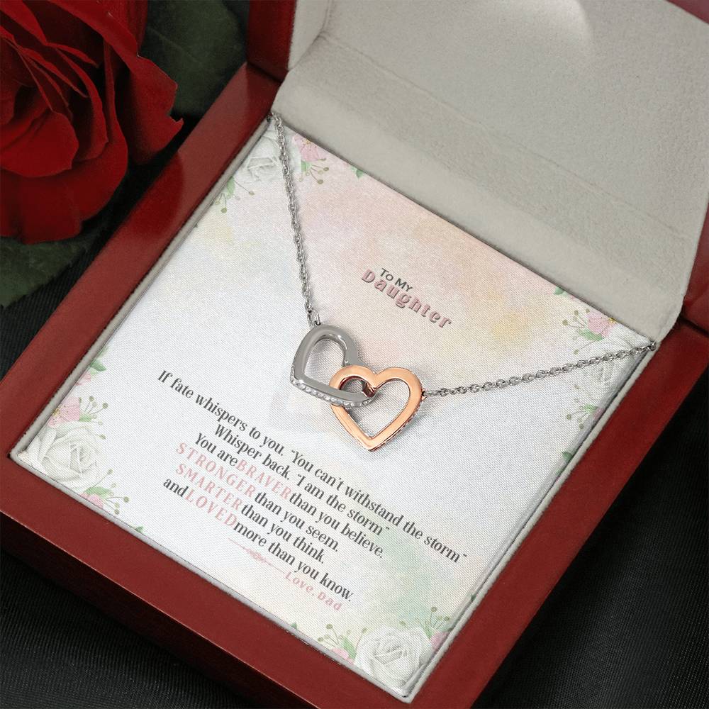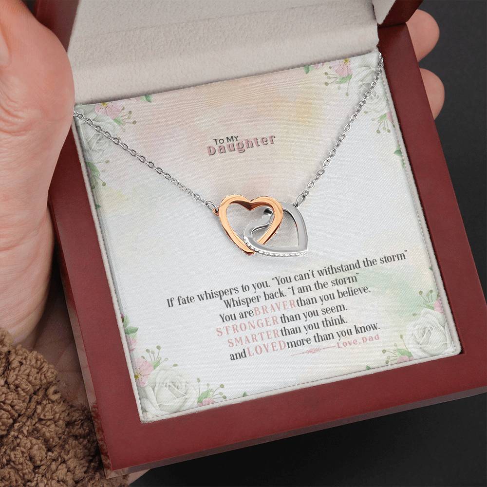 Two hearts embellished with Cubic Zirconia stones, interlocked together as a symbol of never-ending love. Made with high quality polished surgical steel. Cable chain measures 18 inches with a 4 inch extension, and fastens with a lobster clasp.