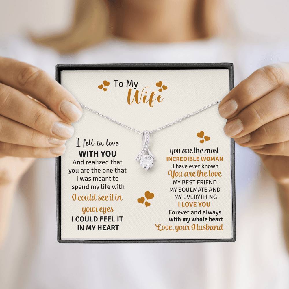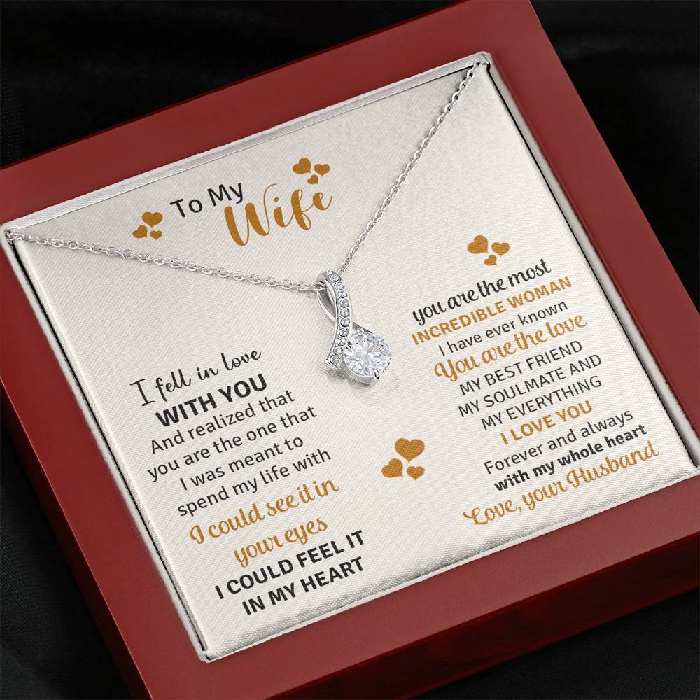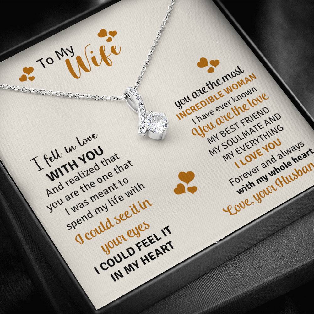Melt her heart with this ALLURING BEAUTY necklace gift! The petite ribbon shaped pendant is finished with 14K white gold over stainless steel, and is embellished with dainty clear crystals surrounded by a sparkling 7mm round cut Cubic Zirconia.